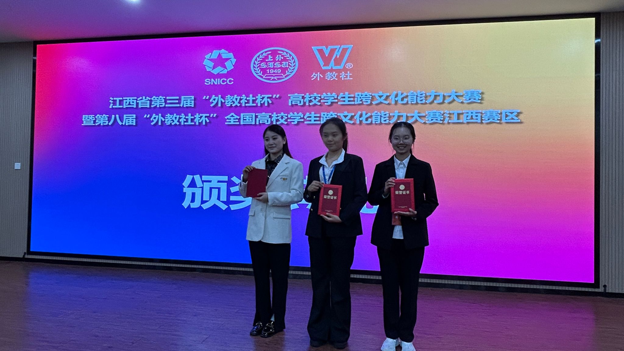 由江西省高等教育学会主办的江西省第三届“外教社杯”高校学生跨文化能力大赛于10月18日至10月19日在江西农业大学举行。我校学子23级英语专业刘籽熙同学、23级审计专业杨择翀同学、25级审计专业邵彬彬同学组建的团队,表现出色,从全省四十一所高校的参赛团队中脱颖而出,最终斩获大赛三等奖,为学校赢得了荣誉。
